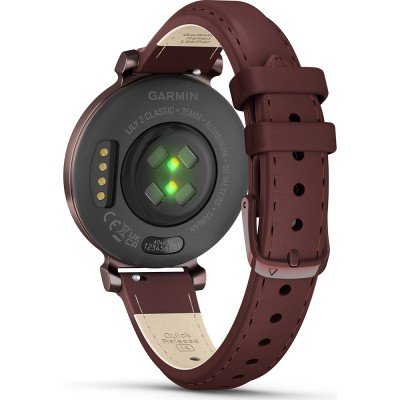 This Garmin watch has a case made of Aluminum with a diameter of 35 mm and is fitted with a leather strap. Inside the case lies a Garmin movement and the watch features a Corning Gorilla Glass 3 crystal.