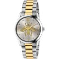 This Gucci watch has a case made of Steel silver with a diameter of 38 mm and is fitted with a Steel silver strap. Inside the case lies a Ronda movement and the watch features a Sapphire crystal.