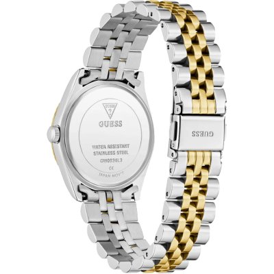 This Guess watch has a case made of Steel silver with a diameter of 34 mm and is fitted with a Steel silver strap. Inside the case lies a Seiko Instruments Inc. movement and the watch features a Mineral crystal.