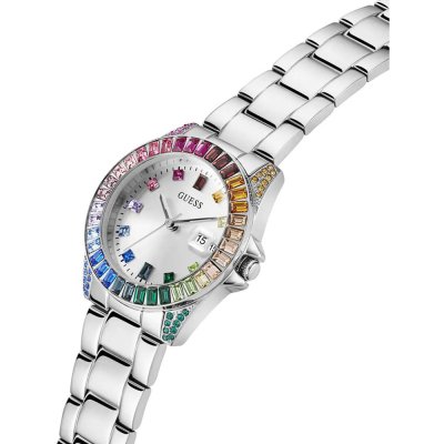 This Guess watch has a case made of Steel silver with a diameter of 34 mm and is fitted with a Steel silver strap. Inside the case lies a Seiko Instruments Inc. movement and the watch features a Mineral crystal.