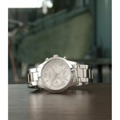 This Guess watch has a case made of Steel silver with a diameter of 40 mm and is fitted with a Steel silver strap. Inside the case lies a Seiko Instruments Inc. movement and the watch features a Mineral crystal.