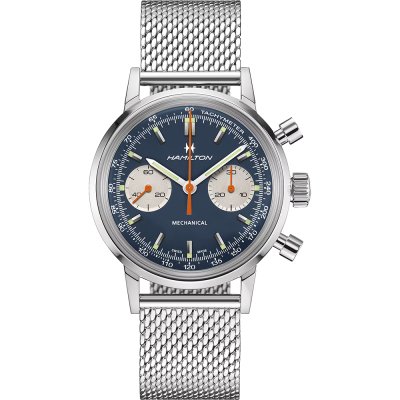This Hamilton watch has a case made of Steel silver with a diameter of 40 mm and is fitted with a leather strap. Inside the case lies a ETA movement and the watch features a Double anti-reflective sapphire crystal.