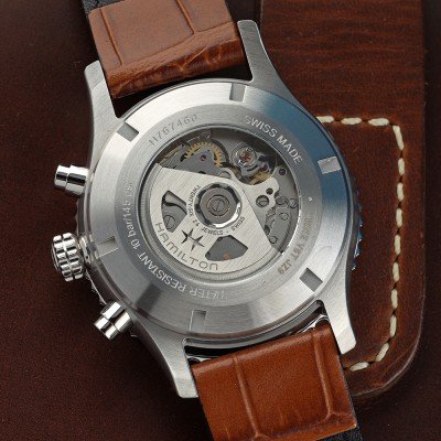 This Hamilton watch has a case made of Steel silver with a diameter of 44 mm and is fitted with a leather strap. Inside the case lies a ETA movement and the watch features a Single anti-reflective sapphire crystal.