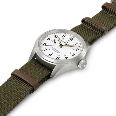 The Hamilton Khaki collection has been expanded with the Khaki Field Mechanical Power Reserve. It is a classic, utilitarian military field watch in the tradition of Hamilton’s military heritage since 1914, known for its robustness and reliability. Adding to this legacy, Hamilton now introduces the first Khaki Field to feature a power reserve indicator on the dial. The watch is powered by the new H-23 movement, developed by ETA exclusively for Hamilton, and is the first Khaki Field to feature an impressive 80-hour power reserve. True to its utilitarian roots, like an army jeep, the power reserve scale on the dial shows only "F" for full and "E" for empty. It is further accompanied by clean 12 and 24-hour military scales, luminous syringe hands, and indices rendered in a warm vintage patina brown, giving the watch a perfect amalgamated look of a vintage military watch with modern technology.