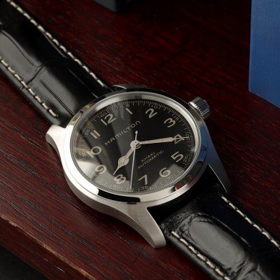 This Hamilton watch has a case made of Steel silver with a diameter of 42 mm and is fitted with a leather strap. Inside the case lies a ETA movement and the watch features a Sapphire crystal.