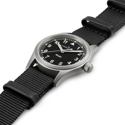 This Hamilton watch has a case made of Steel silver with a diameter of 33 mm and is fitted with a textile strap. Inside the case lies a ETA movement and the watch features a Sapphire crystal.