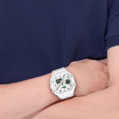 This Lacoste watch has a case made of Resin with a diameter of 44 mm and is fitted with a rubber strap. Inside the case lies a Bao Jie movement and the watch features a Mineral crystal.
