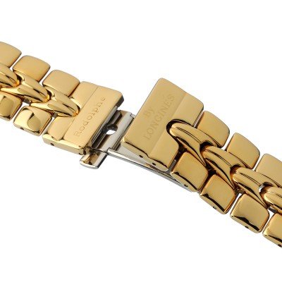 This Longines watch strap is made of stainless steel and is attached to the watch by means of pin and tube. The band has a width of 20 mm and is closed by means of a deployment clasp with push buttons. The strap has no straight mount which means that this strap is only suitable for the watches listed below.