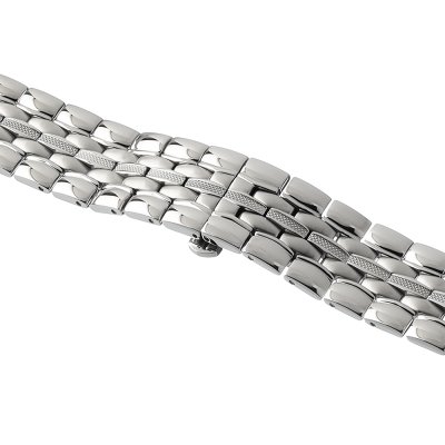 This Maurice Lacroix watch strap is made of stainless steel and is attached to the watch by means of steel pins. The band has a width of 18 mm and is closed by means of a butterfly clasp with push buttons. The strap has no straight mount which means that this strap is only suitable for the watches listed below.
