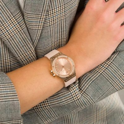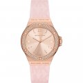 This Michael Kors watch has a case made of Steel silver with a diameter of 37 mm and is fitted with a rubber strap. Inside the case lies a Miyota movement and the watch features a Mineral crystal.