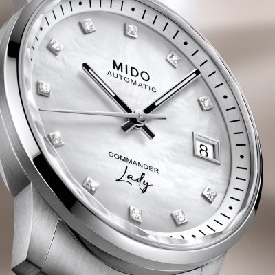 The MIDO Commander series was created in 1995 and has since then been at the heart of their collection. The Commander Lady is a feminine version of this MIDO classic; Almost minimalist in its approach, with tremendous attention to detail. A round case with a slim bezel and beveled minute scale opening up the dial with 11 genuine diamond indices (to a total of 0.0418ct) . Black detailing gives the hands definition and clarity, while the discreet, integrated crown ensures nothing distracts from the main focus. Powered by a Swiss ETA movement with 72 hours power reserve, the MIDO Commander Lady is both strong and stylish.