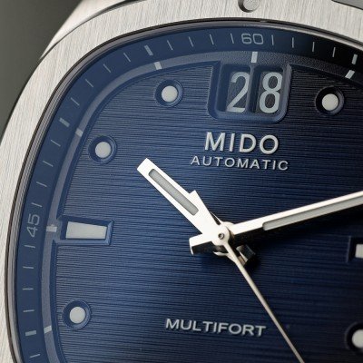 The Mido Multifort TV Big Date is based on a design from the 1970s. This shape was often used for sporty men's watches at the time and is now completely fashionable again, but Mido was originally the first brand to introduce this shape in 1973. The Multifort TV Big Date is available in several colors and offers a choice between a stainless steel bracelet or rubber strap as well as a chronograph version. The watch has a sporty 40 mm size, yet looks elegant thanks to its rounded corners and refined finish. With a choice of various types of easily interchangeable straps, the watch is suitable for every day and occasion.