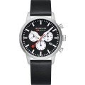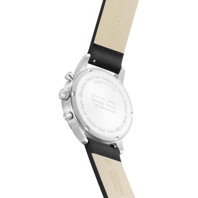 This Mondaine watch has a case made of Steel silver with a diameter of 41 mm and is fitted with a Vegan leather strap. Inside the case lies a Ronda movement and the watch features a Single anti-reflective sapphire crystal.