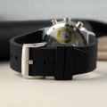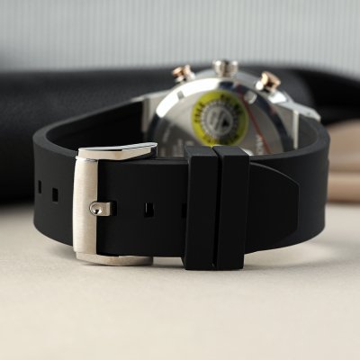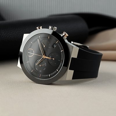 This Movado watch has a case made of Steel silver with a diameter of 44 mm and is fitted with a rubber strap. Inside the case lies a Ronda movement and the watch features a K1 Mineral crystal.