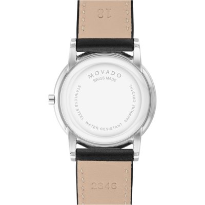 This Movado watch has a case made of Steel silver with a diameter of 33 mm and is fitted with a leather strap. Inside the case lies a ETA movement and the watch features a Sapphire crystal.