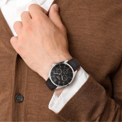 This Olympic watch has a case made of Steel silver with a diameter of 40 mm and is fitted with a leather strap. Inside the case lies a Miyota movement and the watch features a Sapphire crystal.