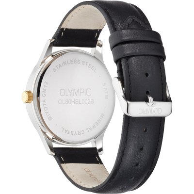 This Olympic watch has a case made of Steel silver with a diameter of 40 mm and is fitted with a leather strap. Inside the case lies a Miyota movement and the watch features a Mineral crystal.
