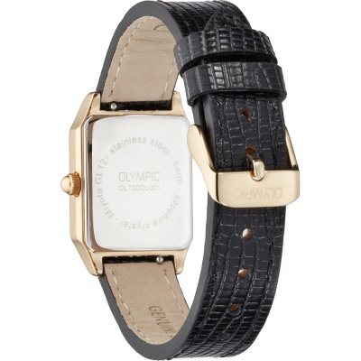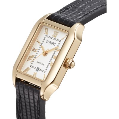 This Olympic watch has a case made of Steel silver with a diameter of 33 mm and is fitted with a leather strap. Inside the case lies a Miyota movement and the watch features a Sapphire crystal.