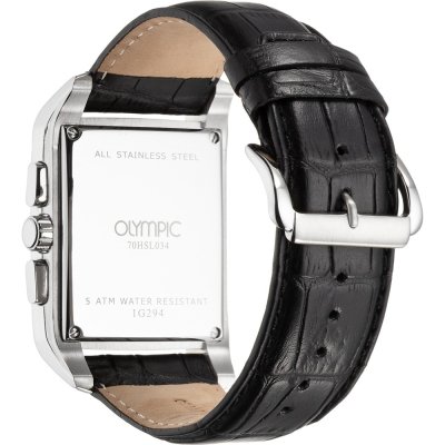 This Olympic watch has a case made of Steel silver with a diameter of 39 mm and is fitted with a leather strap. Inside the case lies a Miyota movement and the watch features a Mineral crystal.