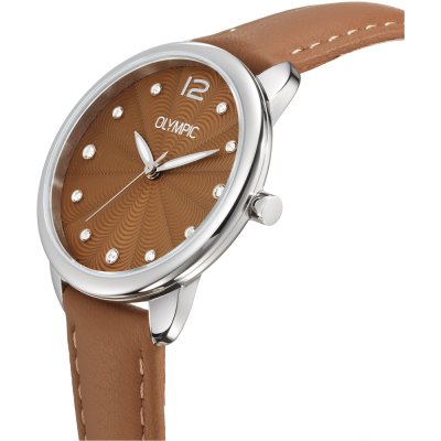 This Olympic watch has a case made of Steel silver with a diameter of 31 mm and is fitted with a leather strap. Inside the case lies a Miyota movement and the watch features a Mineral crystal.