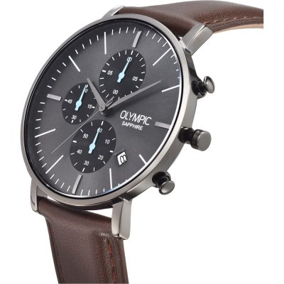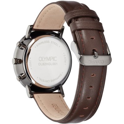 This Olympic watch has a case made of Steel silver with a diameter of 40 mm and is fitted with a leather strap. Inside the case lies a Seiko Instruments Inc. movement and the watch features a Sapphire crystal.