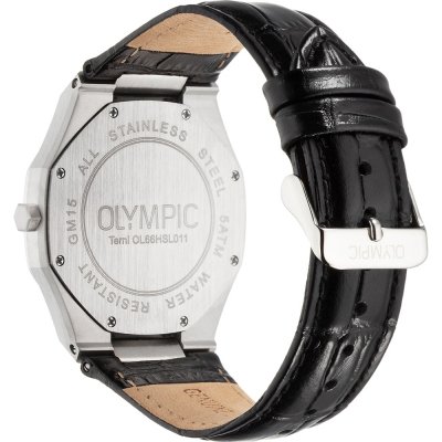 This Olympic watch has a case made of Steel silver with a diameter of 40 mm and is fitted with a leather strap. Inside the case lies a Miyota movement and the watch features a Mineral crystal.