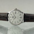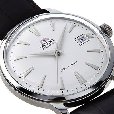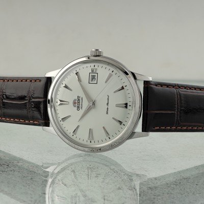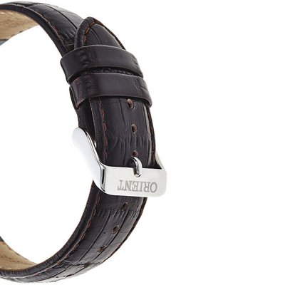 This Orient watch has a case made of Steel silver with a diameter of 40.5 mm and is fitted with a leather strap. Inside the case lies a Orient movement and the watch features a Mineral crystal.