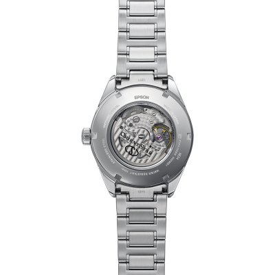 This Orient watch has a case made of Steel silver with a diameter of 40 mm and is fitted with a Metal strap. Inside the case lies a Orient movement and the watch features a Double anti-reflective sapphire crystal.