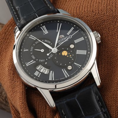 This Orient watch has a case made of Steel silver with a diameter of 42 mm and is fitted with a leather strap. Inside the case lies a Epson movement and the watch features a Sapphire crystal.