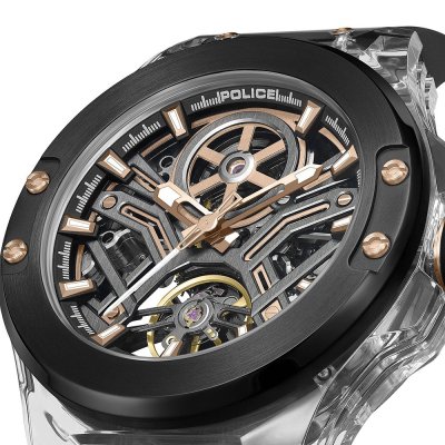 This Police watch has a case made of Resin with a diameter of 44 mm and is fitted with a rubber strap. Inside the case lies a CN movement and the watch features a Mineral crystal.