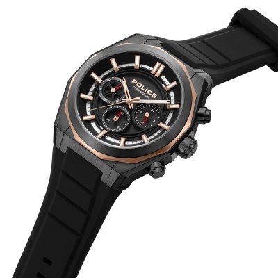 This Police watch has a case made of Steel silver with a diameter of 46 mm and is fitted with a rubber strap. Inside the case lies a Seiko Instruments Inc. movement and the watch features a Mineral crystal.