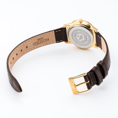 This Roamer watch has a case made of Steel silver with a diameter of 30 mm and is fitted with a leather strap. Inside the case lies a Ronda movement and the watch features a Sapphire crystal.