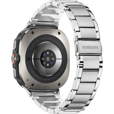 This Samsung watch has a case made of Titanium with a diameter of 47 mm and is fitted with a Steel silver strap.