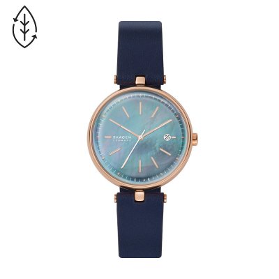This Skagen watch has a case made of Steel silver with a diameter of 36 mm and is fitted with a leather strap. Inside the case lies a Seiko movement and the watch features a Mineral crystal.