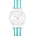 This Swatch watch has a case made of Steel silver with a diameter of 38 mm and is fitted with a rubber strap. Inside the case lies a ETA movement and the watch features a Acrylic crystal.