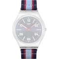 This Swatch watch has a case made of Steel silver with a diameter of 42 mm and is fitted with a textile strap. Inside the case lies a ETA movement and the watch features a Acrylic crystal.