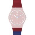 This Swatch watch strap is made of silicone and is attached to the watch by means of steel pins. The band has a width of 17 mm and is closed by means of a buckle. The strap has no straight mount which means that this strap is only suitable for the watches listed below.
