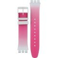 This Swatch watch strap is made of silicone and is attached to the watch by means of steel pins. The band has a width of 19.7 mm and is closed by means of a buckle. The strap has no straight mount which means that this strap is only suitable for the watches listed below.