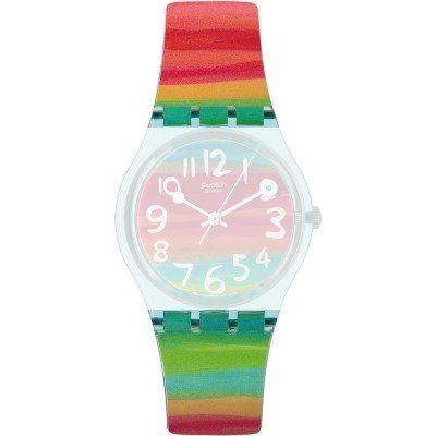 This Swatch watch strap is made of plastic/Resin and is attached to the watch by means of steel pins. The band has a width of 17 mm and is closed by means of a buckle. The strap has no straight mount which means that this strap is only suitable for the watches listed below.