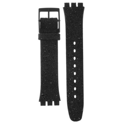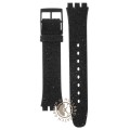 This Swatch watch strap is made of textile leather and is attached to the watch by means of steel pins. The band has a width of 17 mm and is closed by means of a buckle. The strap has no straight mount which means that this strap is only suitable for the watches listed below.