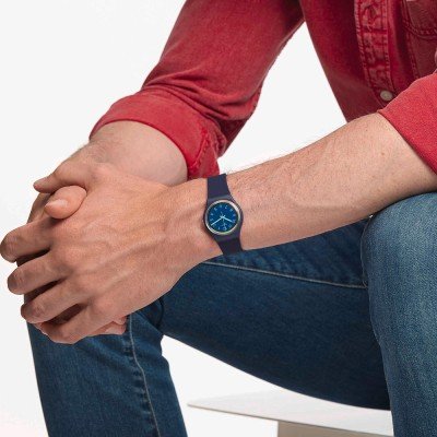 This Swatch watch has a case made of Bio-sourced resin with a diameter of 34 mm and is fitted with a Bio-sourced resin strap. Inside the case lies a ETA movement and the watch features a Acrylic crystal.