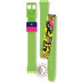 This Swatch watch strap is made of silicone and is attached to the watch by means of steel pins. The band has a width of 12 mm and is closed by means of a buckle. The strap has no straight mount which means that this strap is only suitable for the watches listed below.