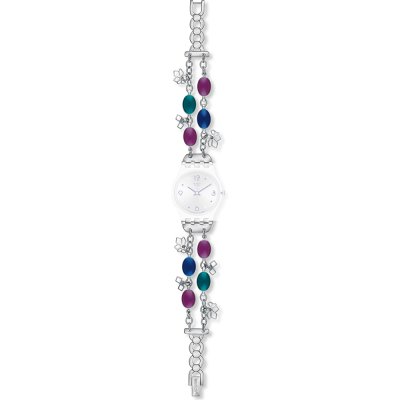 This Swatch watch strap is made of stainless steel and is attached to the watch by means of steel pins. The band has a width of 12 mm and is closed by means of a jewelry clasp. The strap has no straight mount which means that this strap is only suitable for the watches listed below.