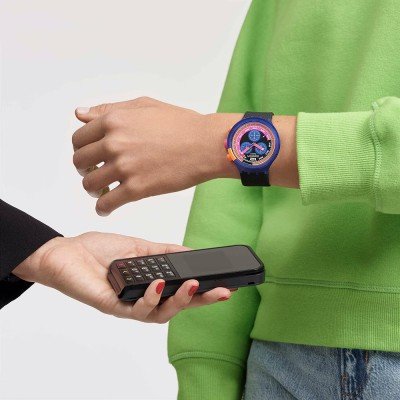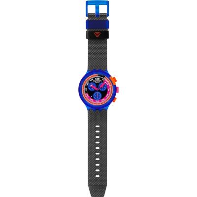 This Swatch watch has a case made of Bio-sourced resin with a diameter of 47 mm and is fitted with a Bio-sourced resin strap. Inside the case lies a ETA movement and the watch features a Acrylic crystal.