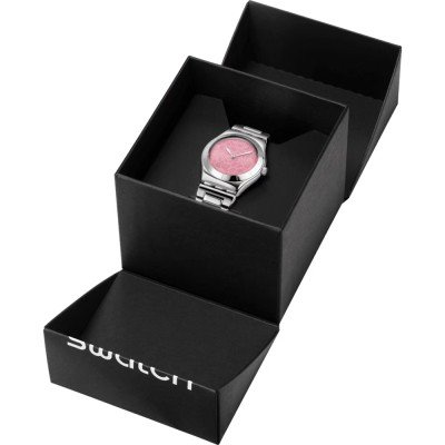 This Swatch watch has a case made of Steel silver with a diameter of 33 mm and is fitted with a Steel silver strap. Inside the case lies a ETA movement and the watch features a Acrylic crystal.