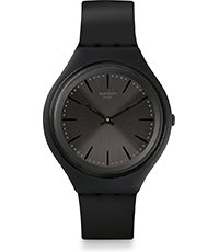This Swatch watch has a plastic case 40mm in diameter and is fitted with a rubber strap. Inside the case lies a quartz movement and the watch features a plexiglass crystal.