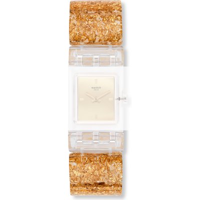 This Swatch watch strap is made of plastic/Resin and is attached to the watch by means of steel pins. The band has a width of 18 mm. The strap has no straight mount which means that this strap is only suitable for the watches listed below.