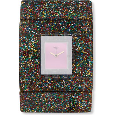 This Swatch watch strap is made of resin and is attached to the watch by means of steel pins. The band has a width of 55 mm. The strap has no straight mount which means that this strap is only suitable for the watches listed below.