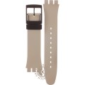 This Swatch watch strap is made of silicone and is attached to the watch by means of steel pins. The band has a width of 19.7 mm and is closed by means of a buckle. The strap has no straight mount which means that this strap is only suitable for the watches listed below.