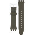 This Swatch watch strap is made of silicone and is attached to the watch by means of steel pins. The band has a width of 19.7 mm and is closed by means of a buckle. The strap has no straight mount which means that this strap is only suitable for the watches listed below.